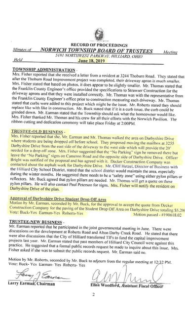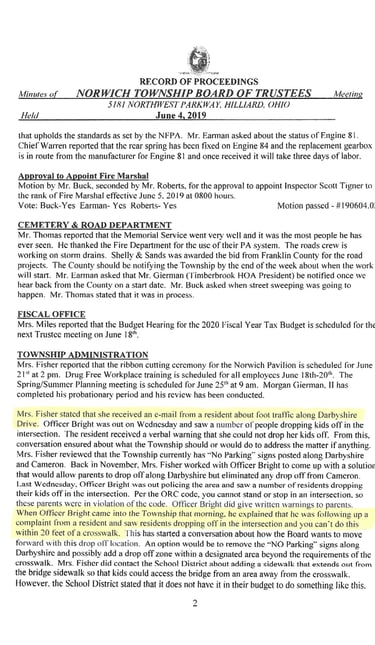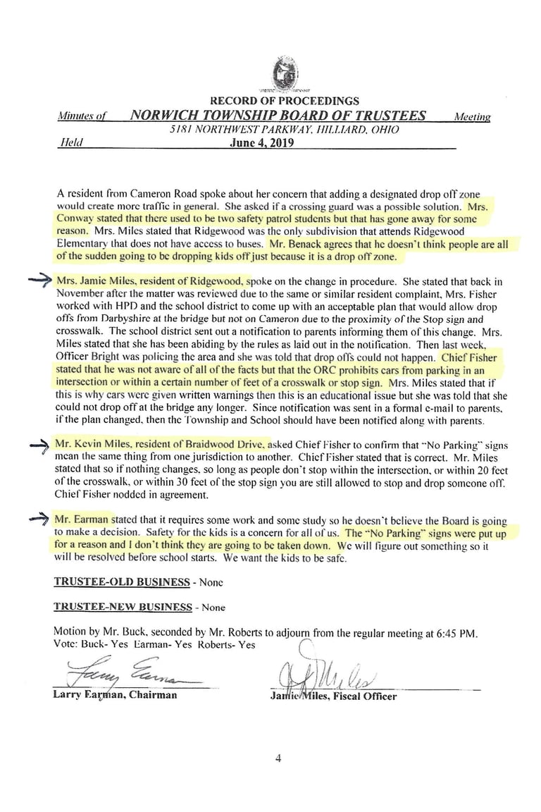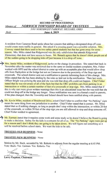 Jamie Fisher (Township Administrator) and Jamie Miles (Township Fiscal Officer) both had children that attended Ridgewood Elementary School at the time these meetings took place and they both wanted to make sure the "No Parking Signs" were removed so they could use the School Bridgeway Drop Off.