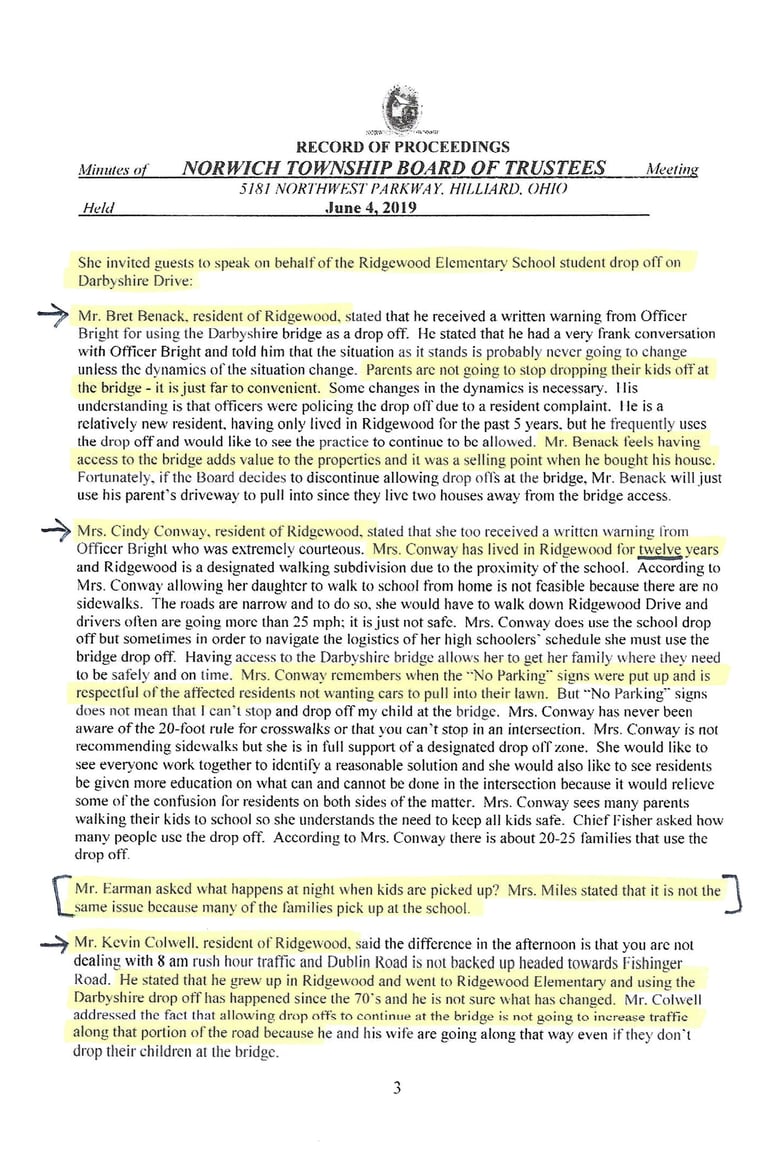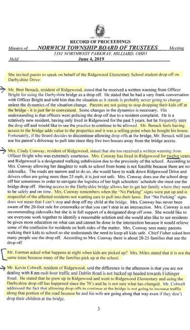 First - On Page 3 below, Jamie Fisher (Township Administrator) states "She invited guests to speak on behalf of the Ridgewood Elementary School student drop off on Darbyshire Dr.