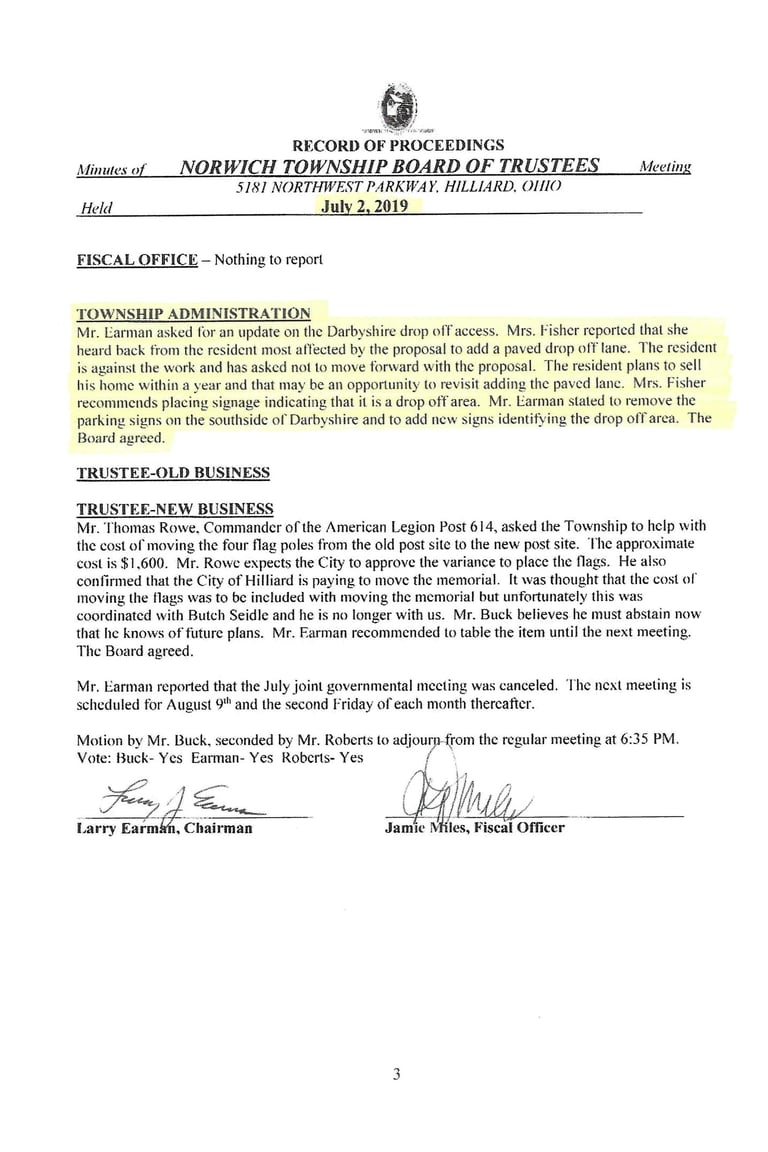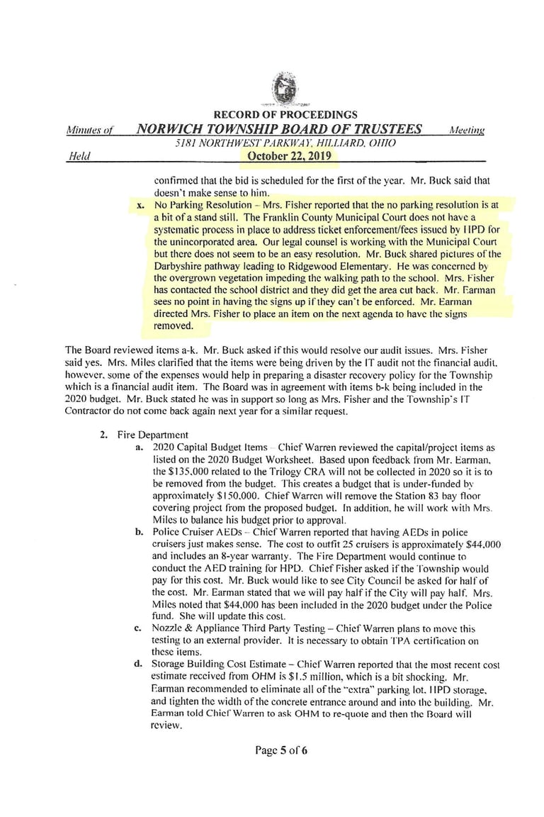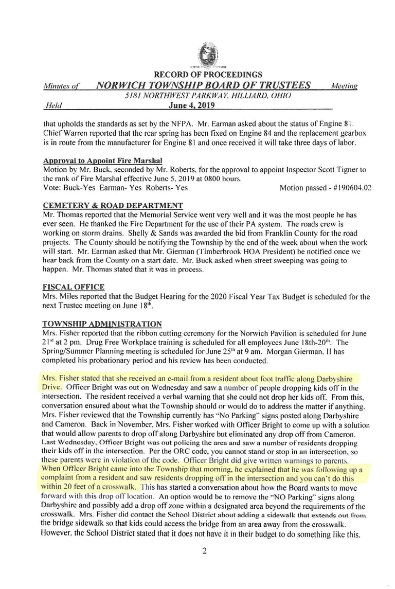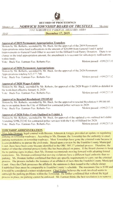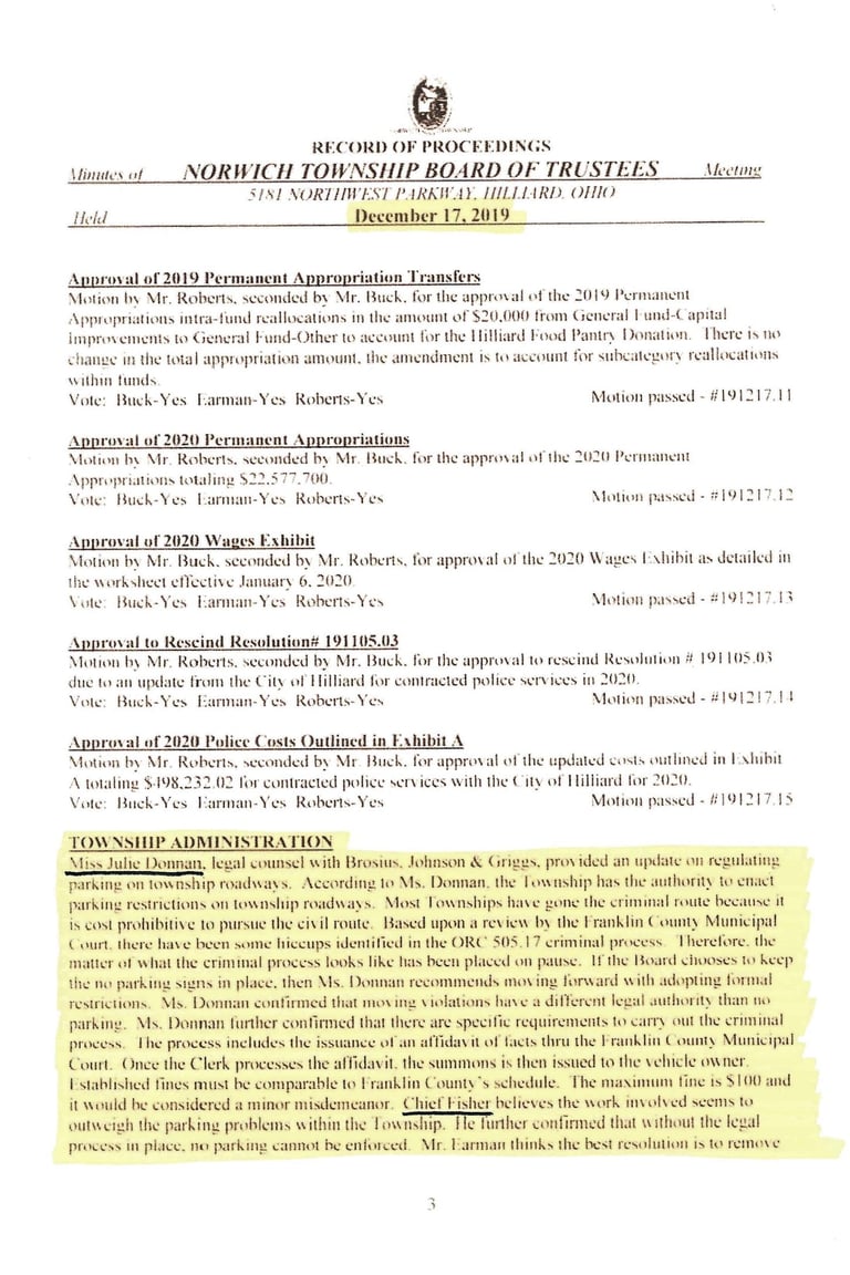 "Chief Fisher (Hilliard Police Department) believes the work involved seems to outweigh the parking problems within the Township".