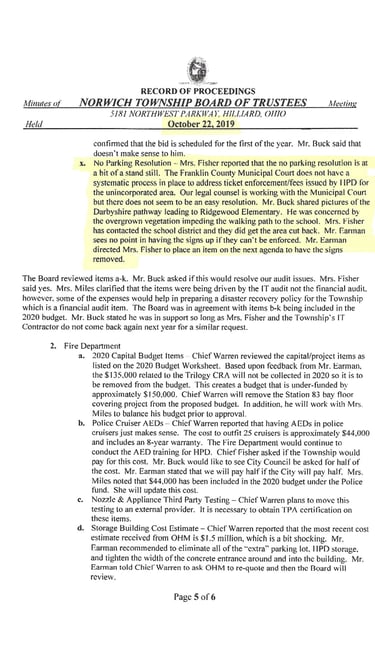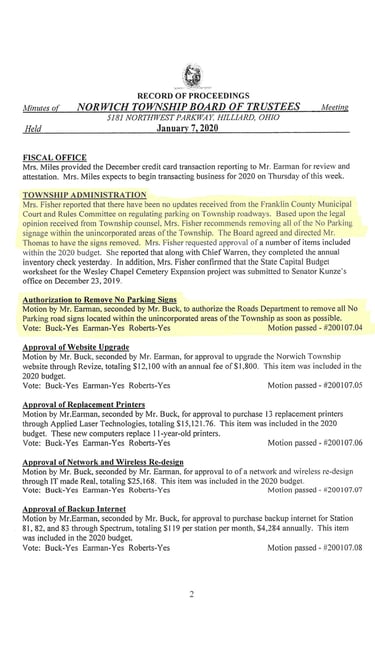 "Mrs. Fisher recommends removing all of the No Parking signage within the unincorporated areas of the Township".
