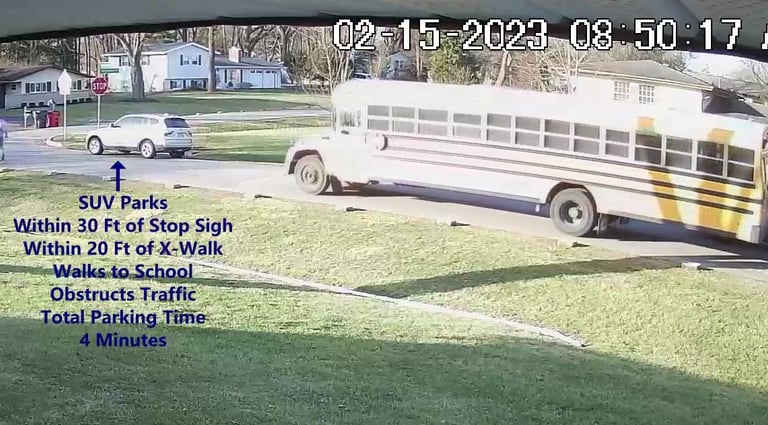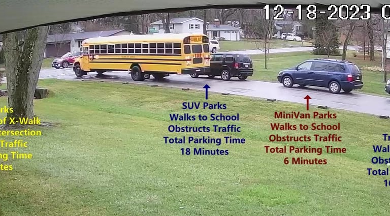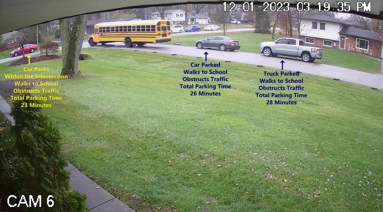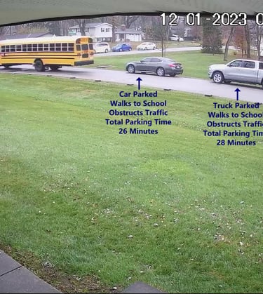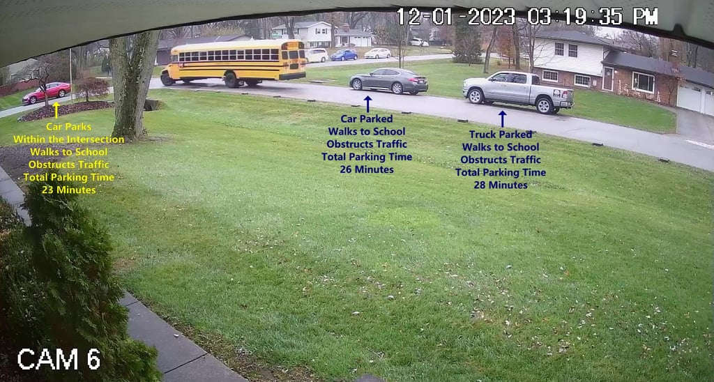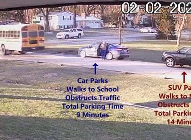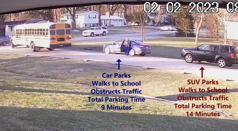 Car - Parks on Darbyshire Dr, walks over to the School, obstructs Traffic - Total Parking Time was 4 minutes.