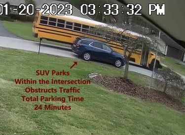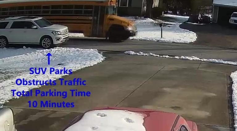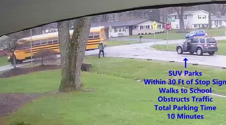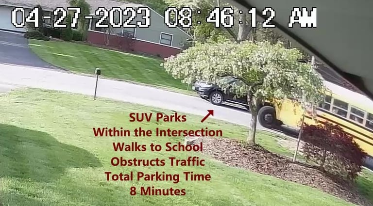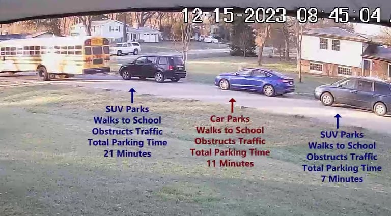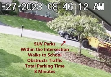 SUV - Parks on Darbyshire Dr, walks over to the School, obstructs Traffic - Total Parking Time was 9 minutes.