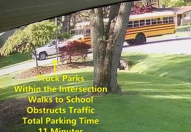 Truck - Parks on Cameron Rd, walks over to the school, obstructs Traffic - Total Parking Time was 12 minutes.