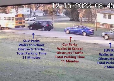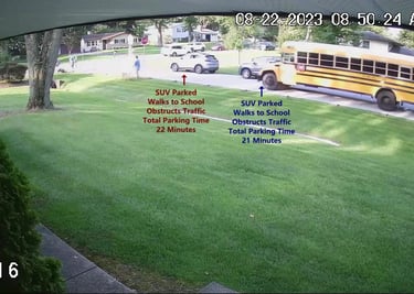 SUV - Parks on Cameron Rd, walks over to the School, obstructs Traffic - Total Parking Time was 21 minutes.