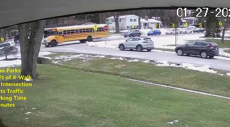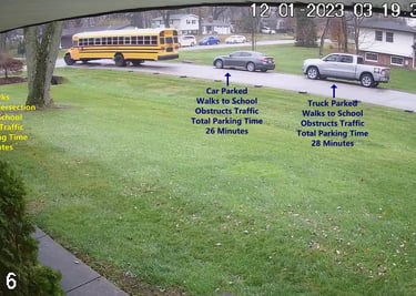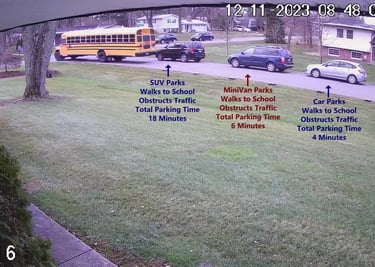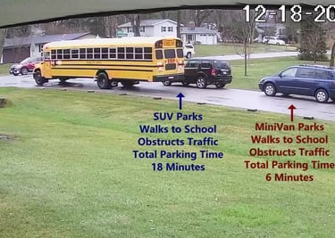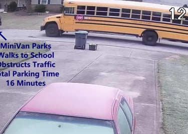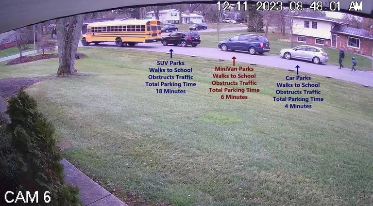 MiniVan - Parks on Cameron Rd, walks over to the School, obstructs Traffic - Total Parking Time was 6 minutes.