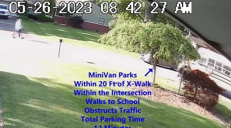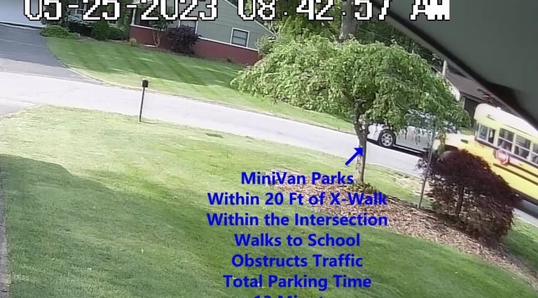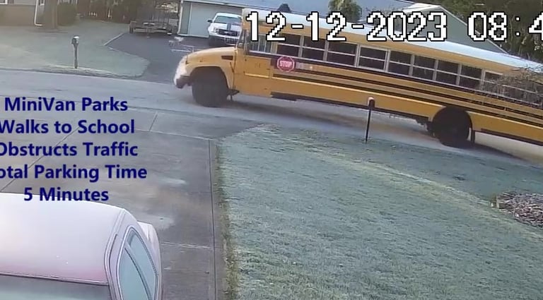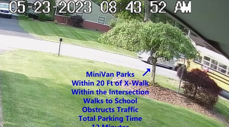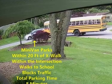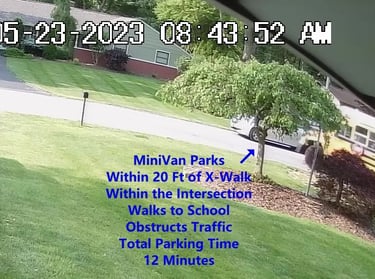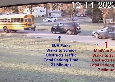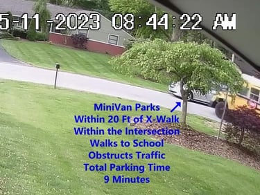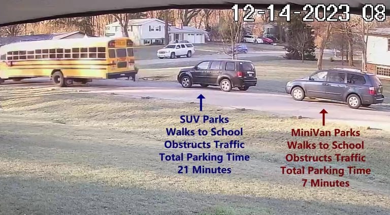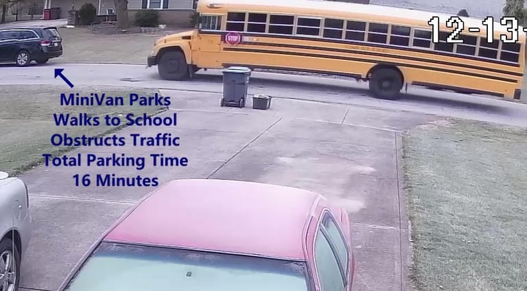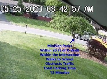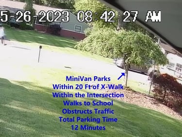 MiniVan - Parks on Cameron Rd, walks over to the School, obstructs Traffic - Total Parking Time was 7 minutes.