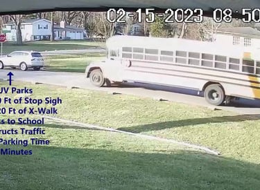 Bus Driver has to get around SUV that's parked on Cameron Rd, within 30 Ft of Stop Sign.