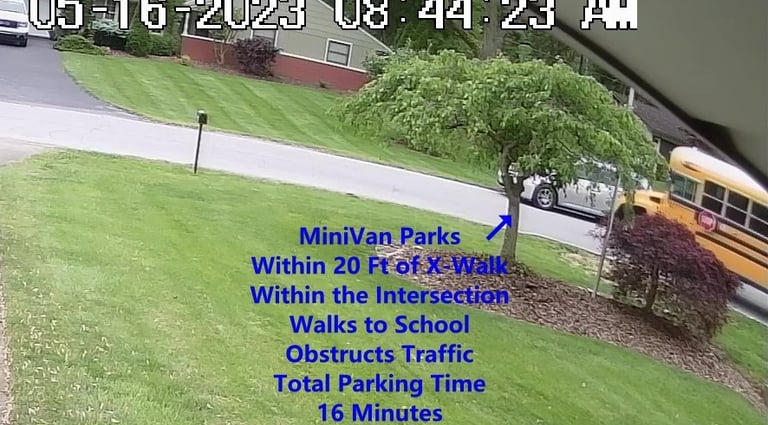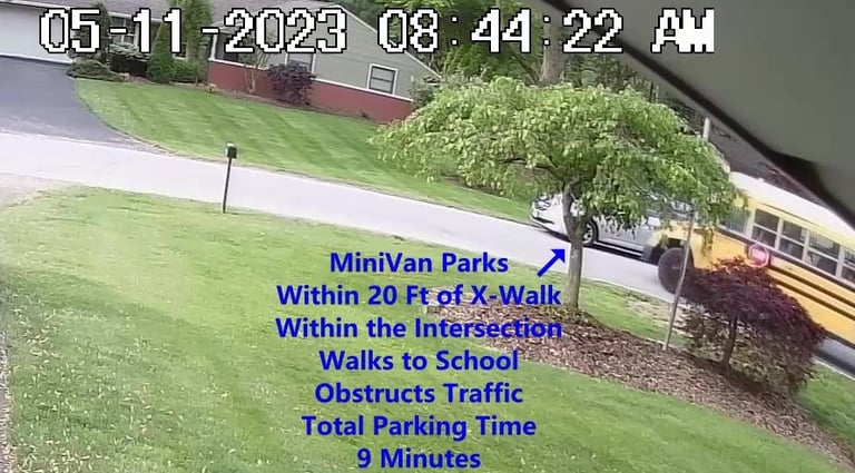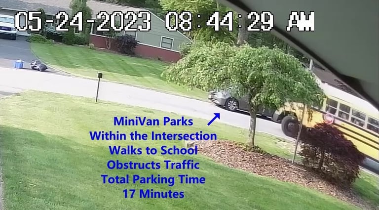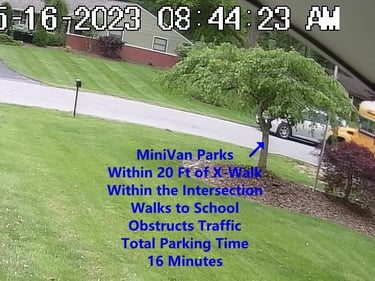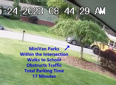 MiniVan - Parks on Darbyshire Dr, walks over to the School, obstructs Traffic - Total Parking Time was 5 minutes.