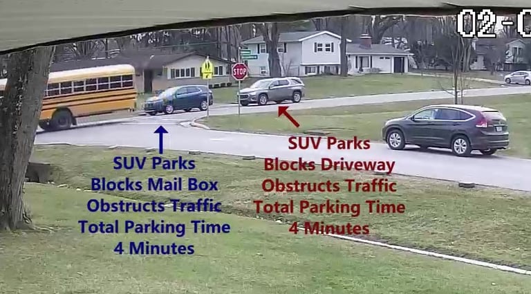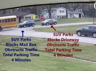 SUV - Parks on Darbyshire Dr, blocks Mail Box, obstructs traffic - Total Parking Time was 4 minutes.