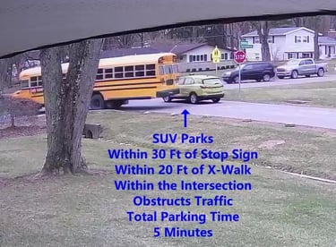 SUV - Parks on Cameron Rd, within 30 Ft of Stop Sign, walks over to the school, obstructs traffic - Total Parking Time was 10 minutes.