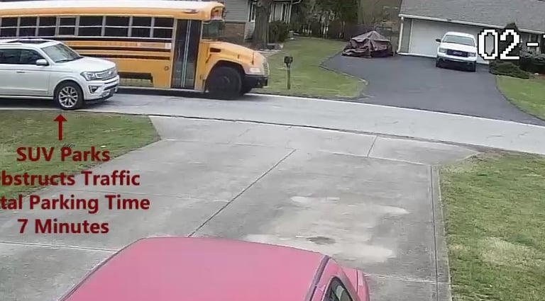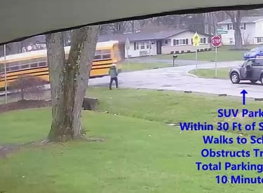 SUV - Parks on Cameron Rd, walks over to the school, obstructs Traffic - Total Parking Time was 11 minutes.