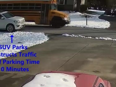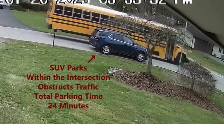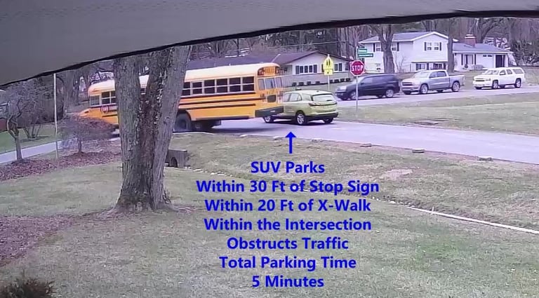 SUV - Parks on Darbyshire Dr, within 20 Ft of X-Walk, within the Intersection, obstructs Traffic - Total Parking Time was 1 minutes (moves when bus approaches).