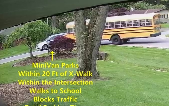 MiniVan - Parks on Darbyshire Dr, within 20 ft of the X-Walk, within the Intersection, walks over to the school, obstructs Traffic and School Bus.