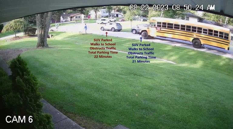 SUV - Parks on Cameron Rd, walks over to the School, obstructs Traffic - Total Parking Time was 23 minutes.